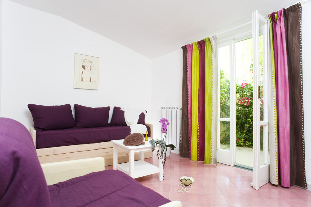 Appartamento bilocale per 5 persone, posto a piano giardino. Dispone di una camera con letto matrimoniale, soggiorno con divano letto doppio, cucina abitabile, bagno con doccia, ampio terrazzo indipentente con barbecue.